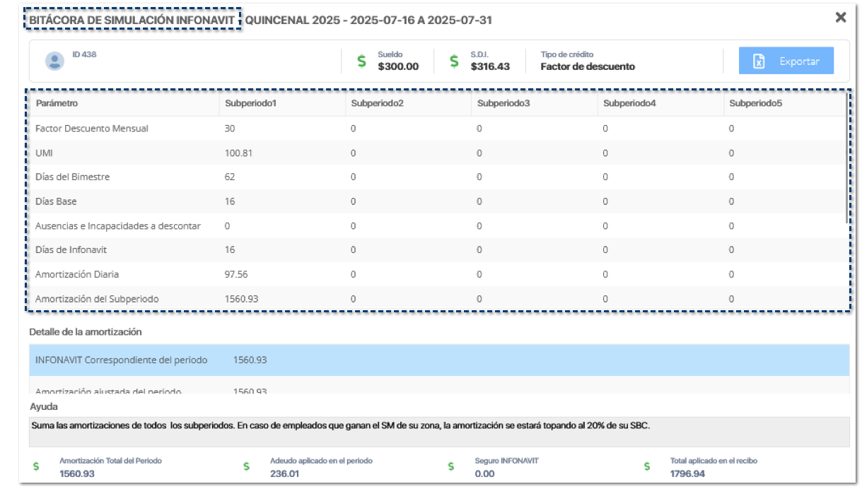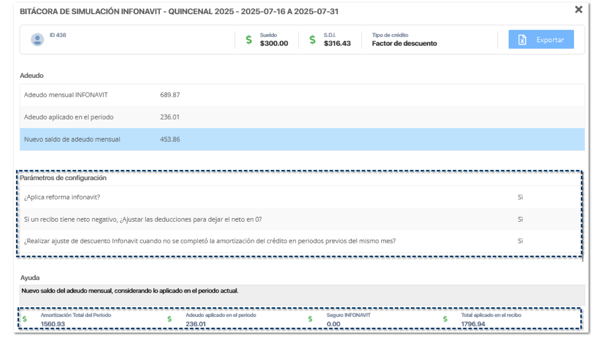 Al ejecutar la BITÁCORA DE SIMULACIÓN INFONAVIT dentro del recibo de nómina, visualizarás los parámetros de configuración del Infonavit, quedando de la siguiente manera: