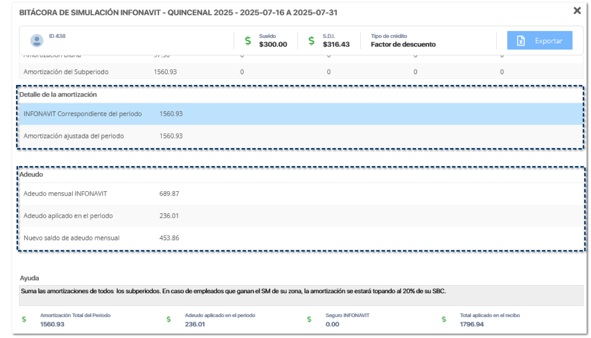 Cuando el empleado tenga un crédito en Factor de descuento INFONAVIT (antes VSM) o Cuota fija en pesos, al revisar la simulación de Infonavit, se visualizarán nuevas secciones detalladas para mostrar la trazabilidad del cálculo: