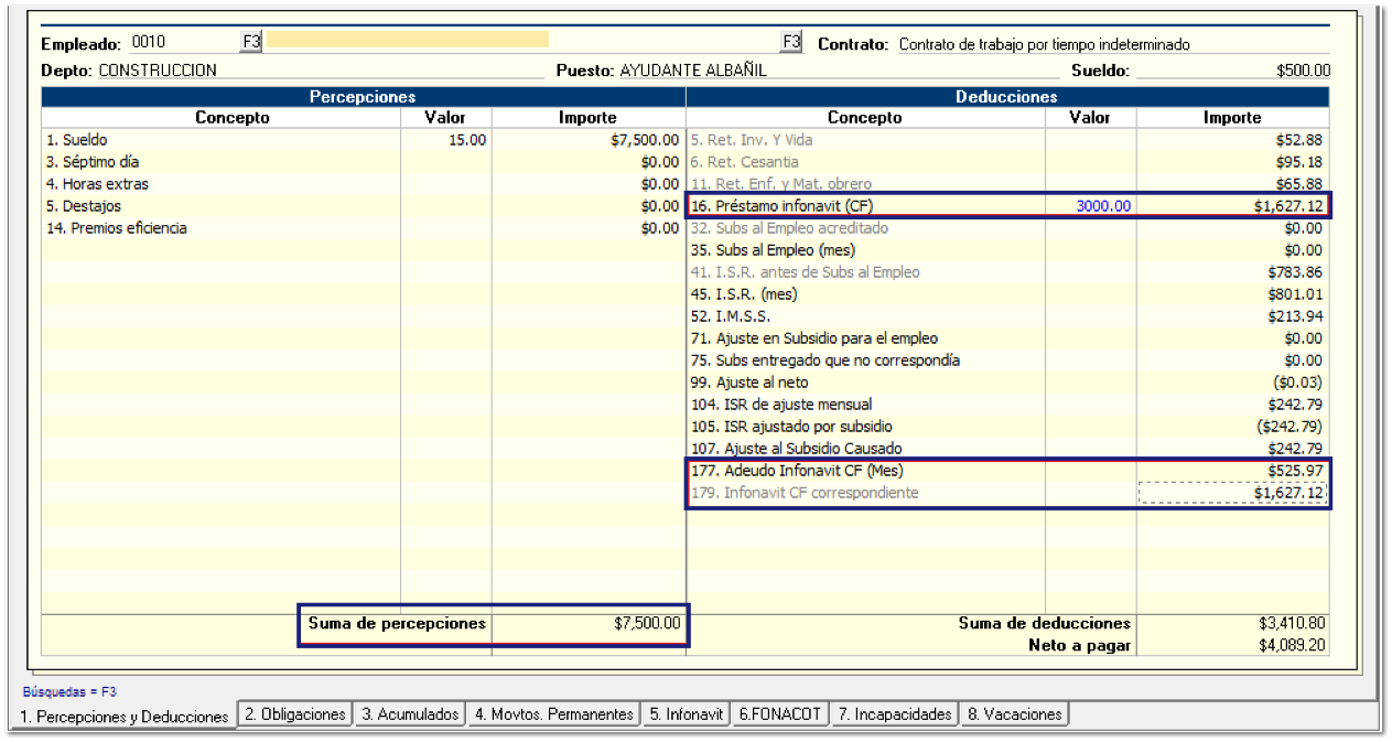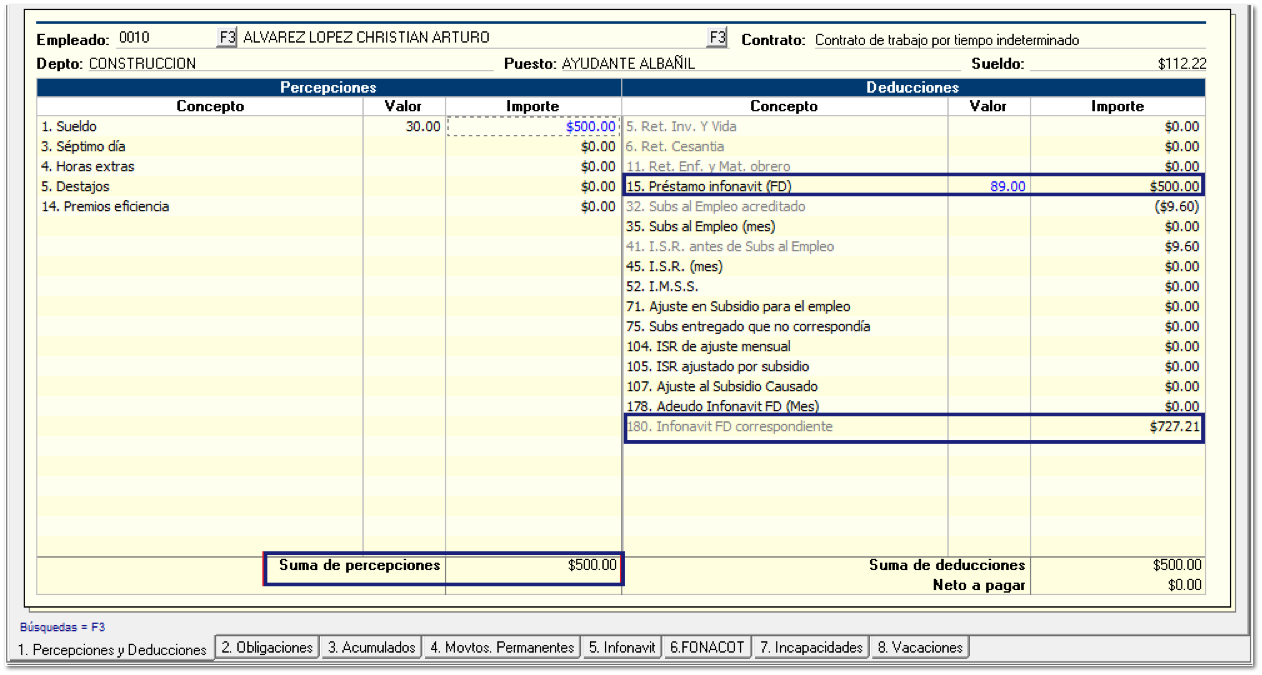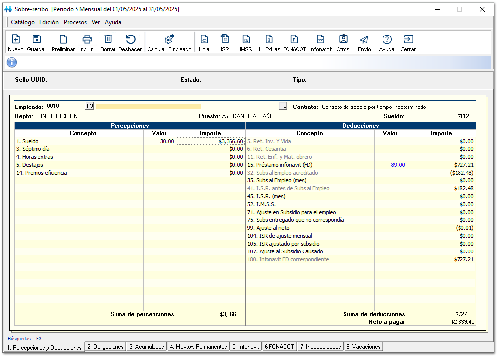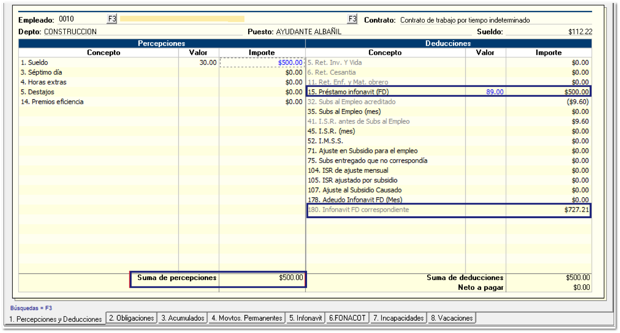 Al calcular se agrega el nuevo concepto especie de Infonavit, sólo si el empleado tiene crédito Infonavit.