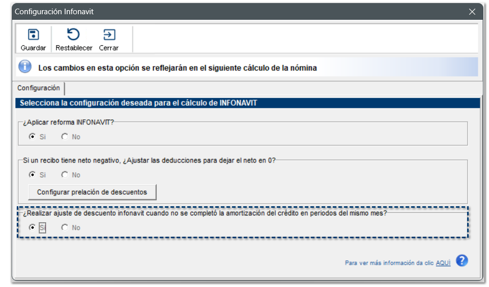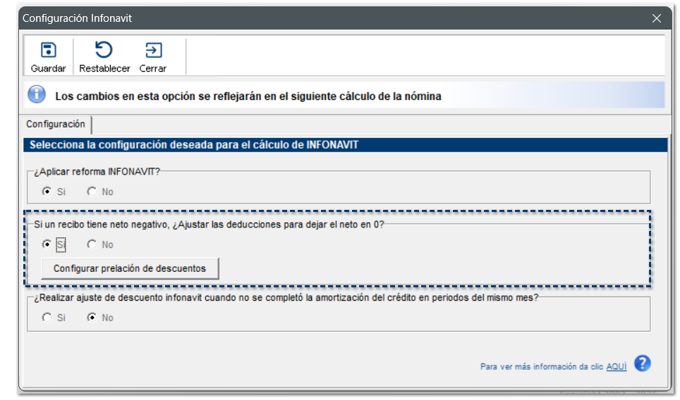 En caso de que exista un ajuste por prelación con la bandera activada en la Configuración de cálculo de Infonavit, el importe ajustado al Neto varía del calculado y el saldo del periodo muestra la diferencia entre lo que debió retenerse y lo que se pudo retener.