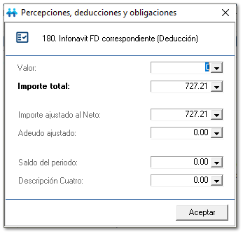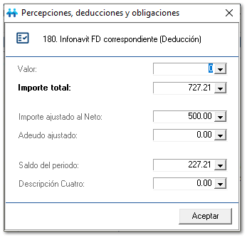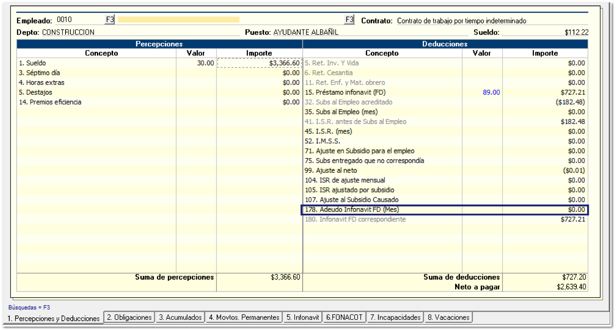 Al calcular se agrega el concepto nuevo de Adeudo sólo si el empleado tiene crédito Infonavit CF o FD y tiene la bandera de ajuste de saldos activada desde la Configuración para cálculo de Infonavit.