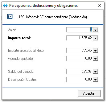 Al autorizar el periodo, siempre que se continúe en el mismo mes, el saldo del periodo anterior se verá reflejado en el nuevo concepto de Adeudo mes del Infonavit.