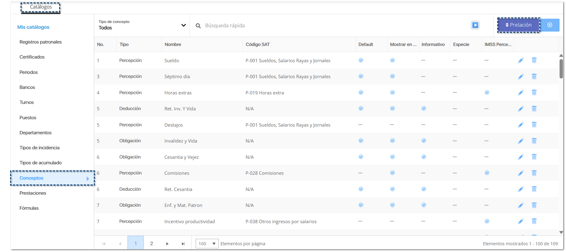 Dentro del listado de Catálogos, selecciona el catálogo de Conceptos, visualizarás el nuevo el botón Prelación: