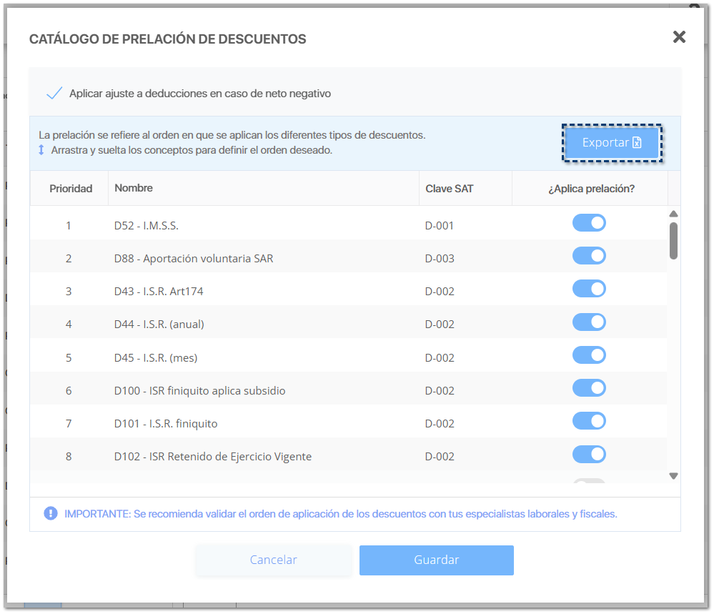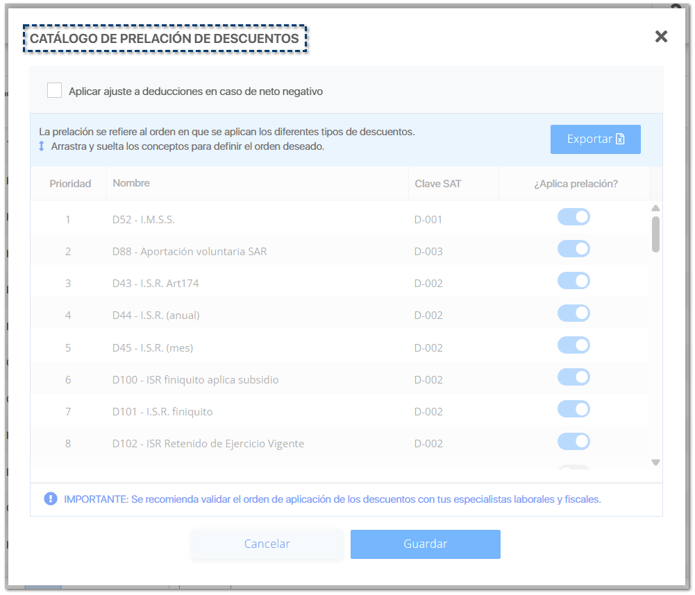 Al haces clic en el botón Prelación, se mostrará la ventana CATÁLOGO DE PRELACIÓN DE DESCUENTOS, en la que podrás personalizar el orden de aplicación de las deducciones en escenarios de ingresos insuficientes.