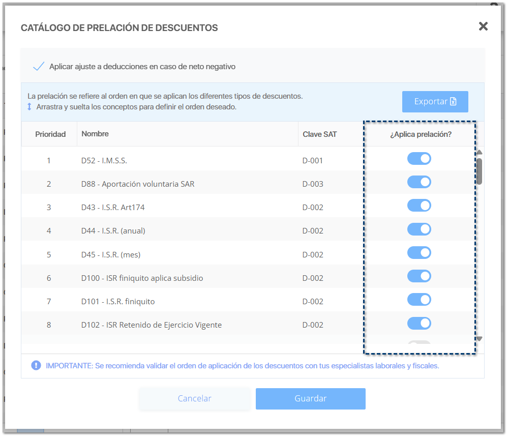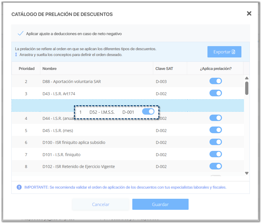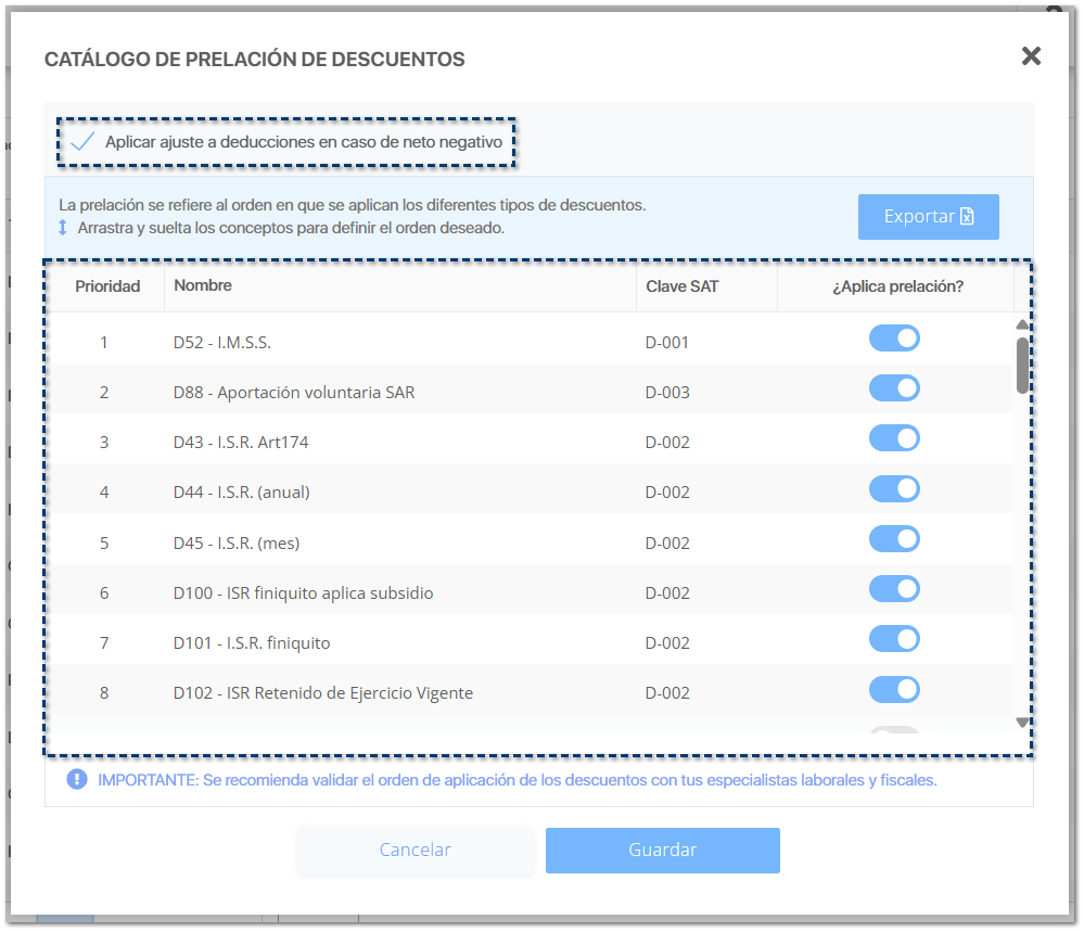 Para cambiar la prioridad o definir el nuevo orden de cada concepto de deducción, podrás arrastrar el concepto hacia arriba o hacia abajo.