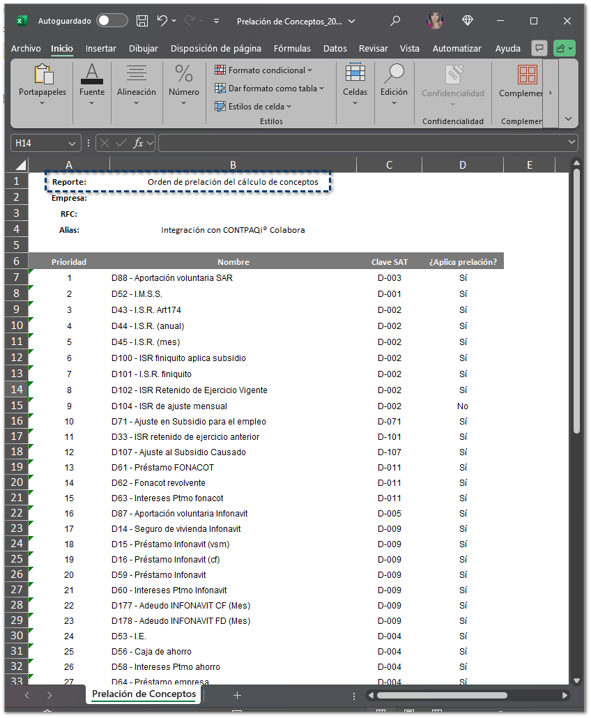 El módulo trae un orden predeterminado, conforme a las claves SAT de los conceptos de deducción: