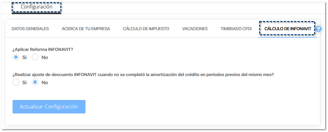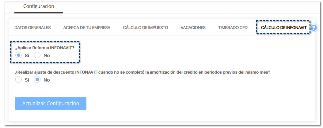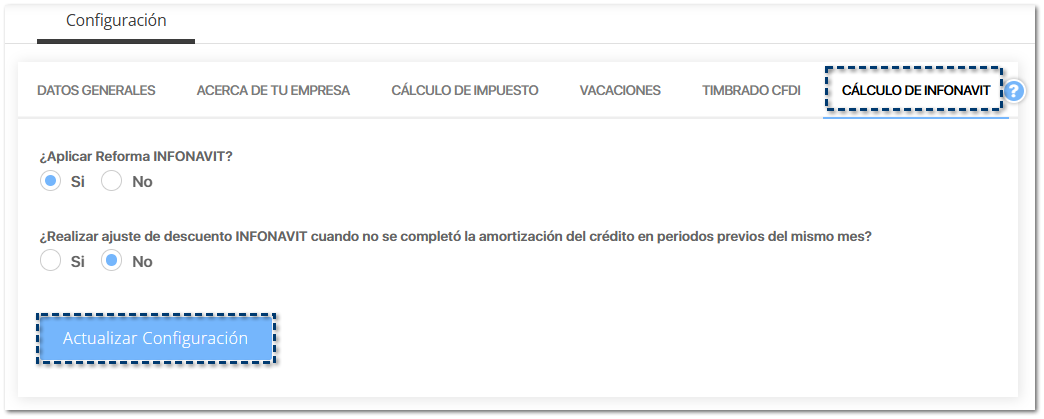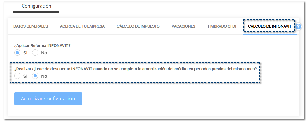 Una vez que hayas establecido la configuración correspondiente para el cálculo de amortizaciones de INFONAVIT, haz clic en el botón Actualizar Configuración, para guardar cambios.