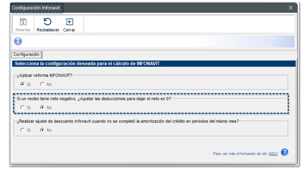 ¿Aplicar reforma INFONAVIT?Este parámetro te permitirá configurar si deseas realizar el cálculo de los créditos de INFONAVIT, conforme a la nueva reforma.