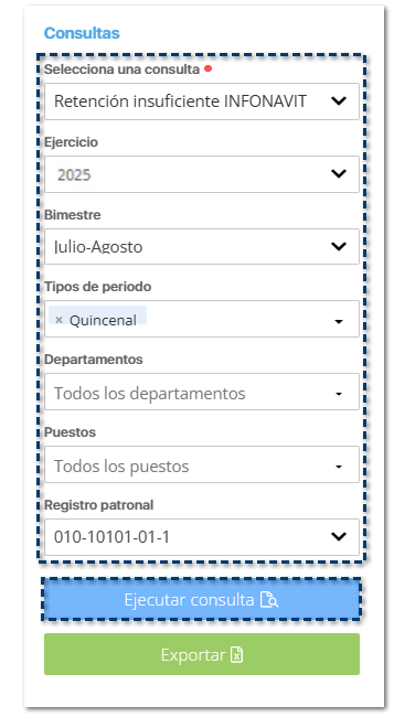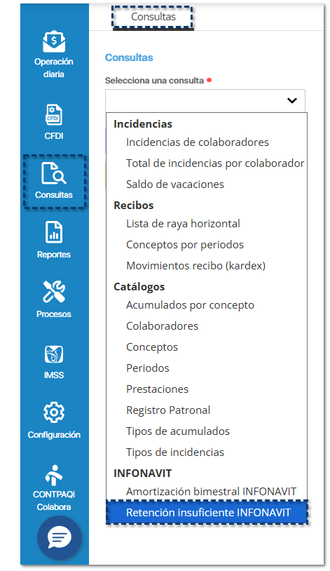 Al ingresar al módulo Consultas, se agrega la nueva consulta Retención insuficiente INFONAVIT en la sección INFONAVIT: