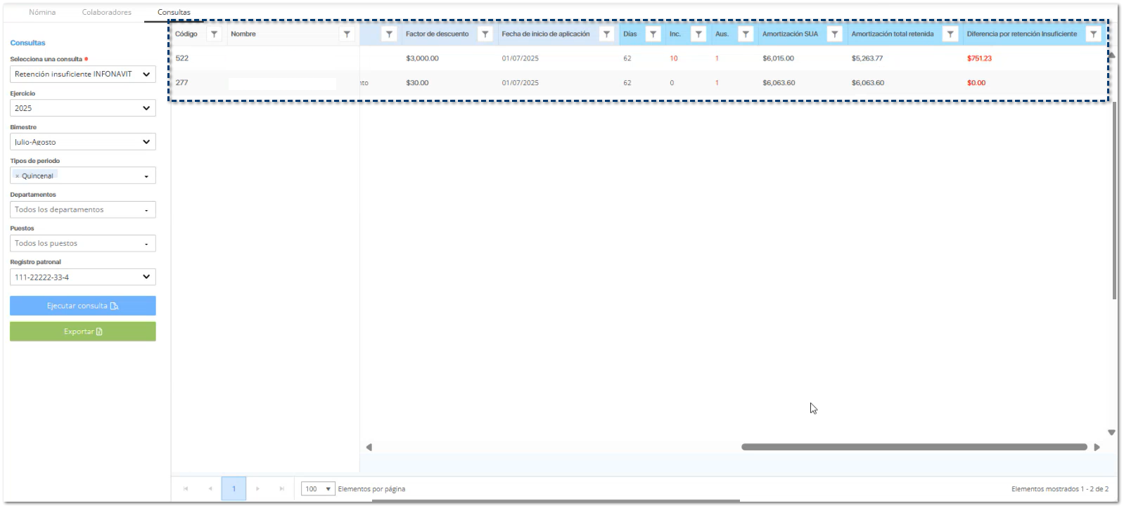 Se incluye una nueva consulta Retención insuficiente INFONAVIT que ayudará a detectar empleados que tuvieron retención insuficiente de Infonavit para poder capturar el importe de lo retenido en la nueva versión liberada de SUA.