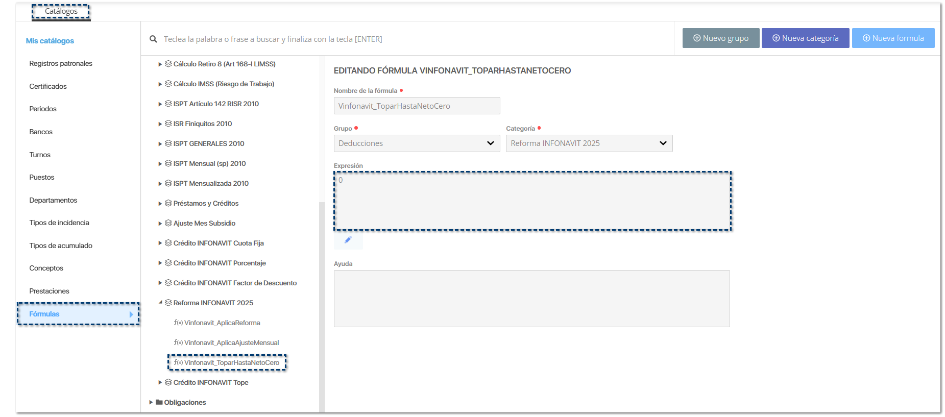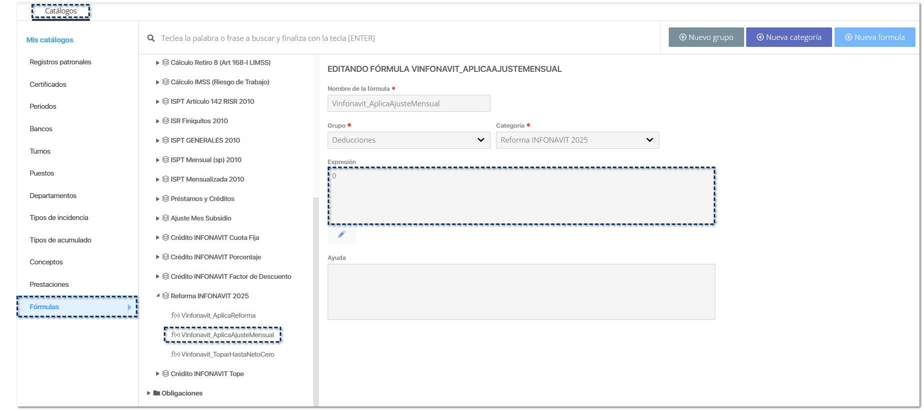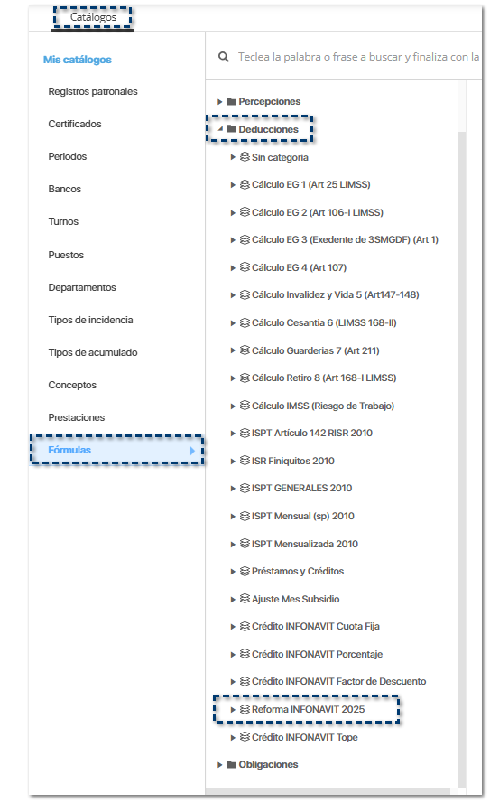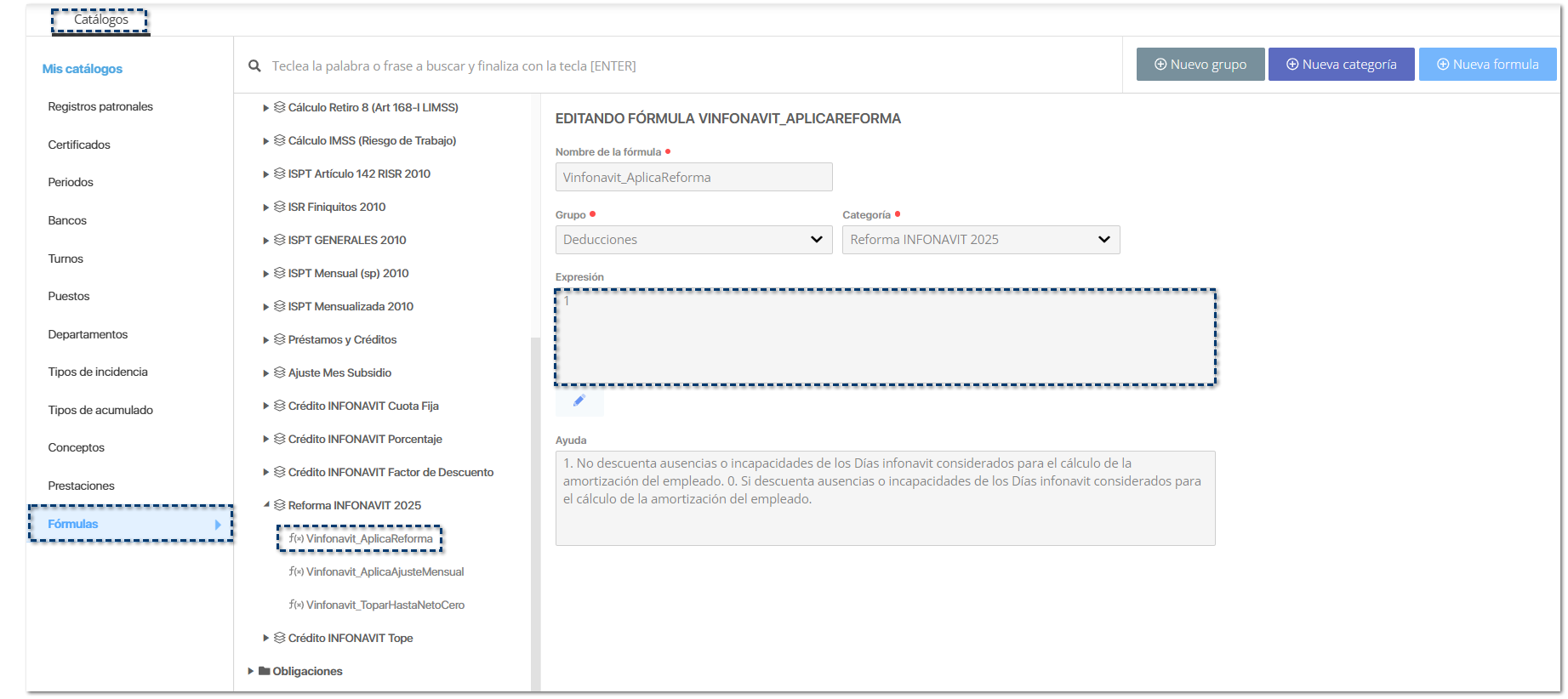 ![]() Dentro del listado de Fórmulas, se agrega una nueva categoría Reforma INFONAVIT 2025 para almacenar las nuevas fórmulas.