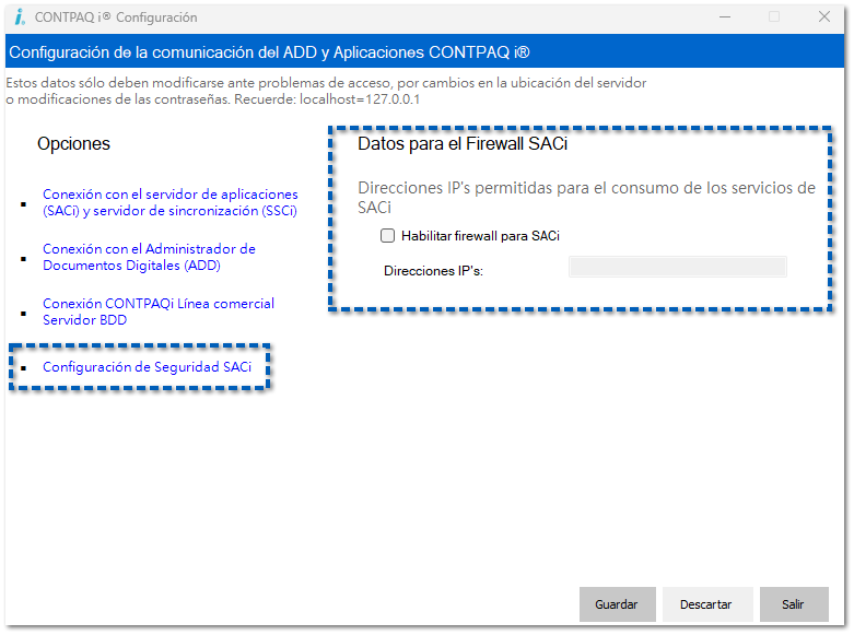 Para realizar la configuración, es necesario activar la casilla Habilitar firewall para SACi y realizar lo siguiente: