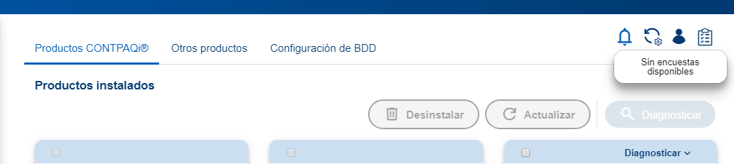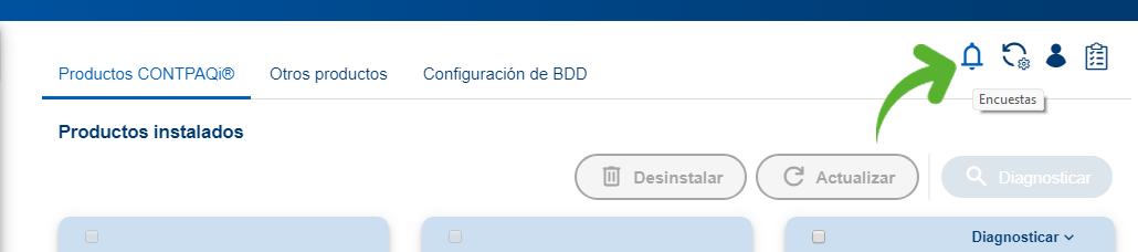 En el icono de campana que se muestra en la parte superior de la aplicación, podrás ver las notificaciones sobre las encuestas que tienes disponibles para contestar sobre los productos CONTPAQi®.