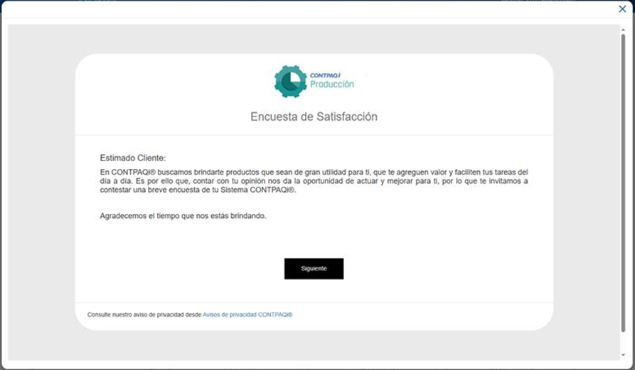 • Las encuestas son generadas desde un administrador interno, por medio del cuál recibiremos tu opinión sobre los sistemas CONTPAQi®.