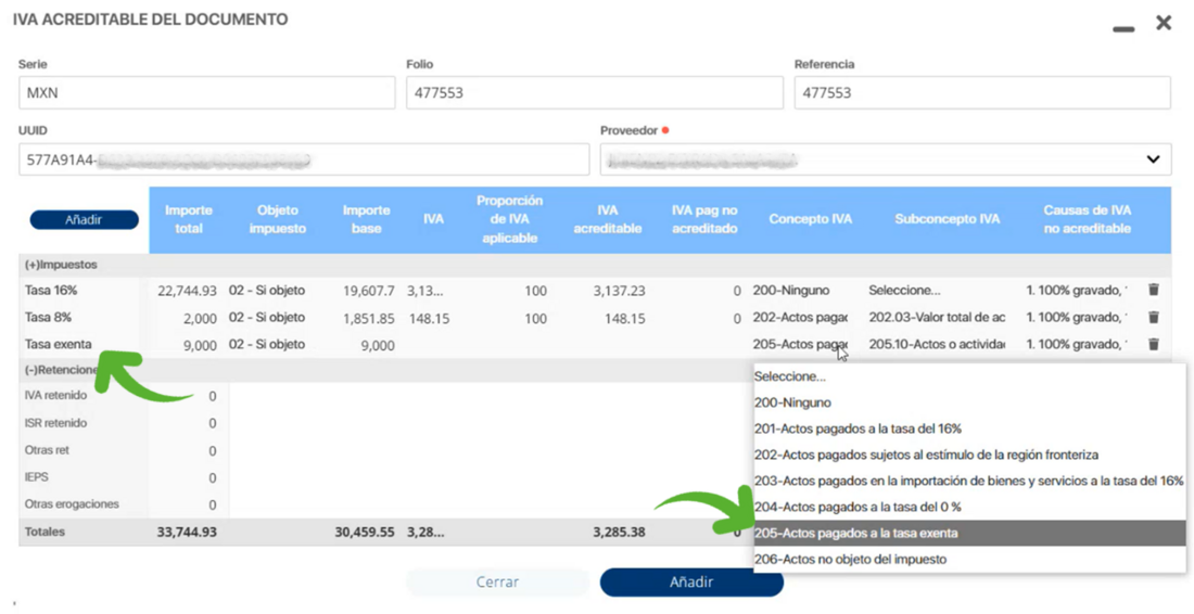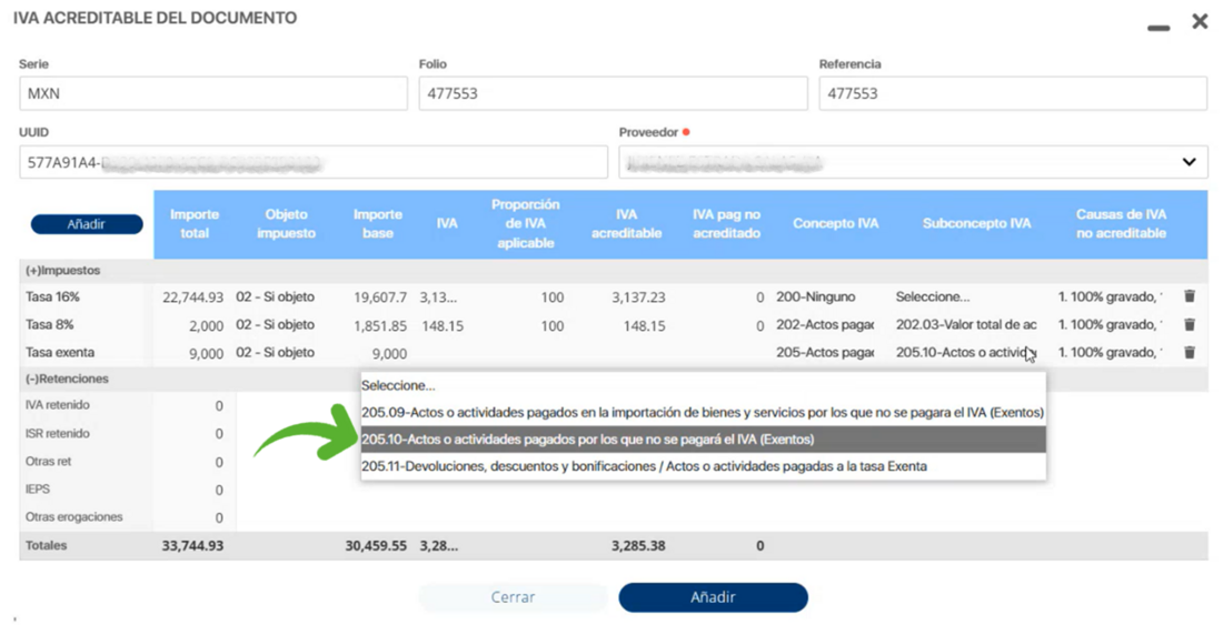 Y en el subconcepto, se asigna el "205.09-Actos o actividades pagados por los que no se pagará el IVA (Exentos)".