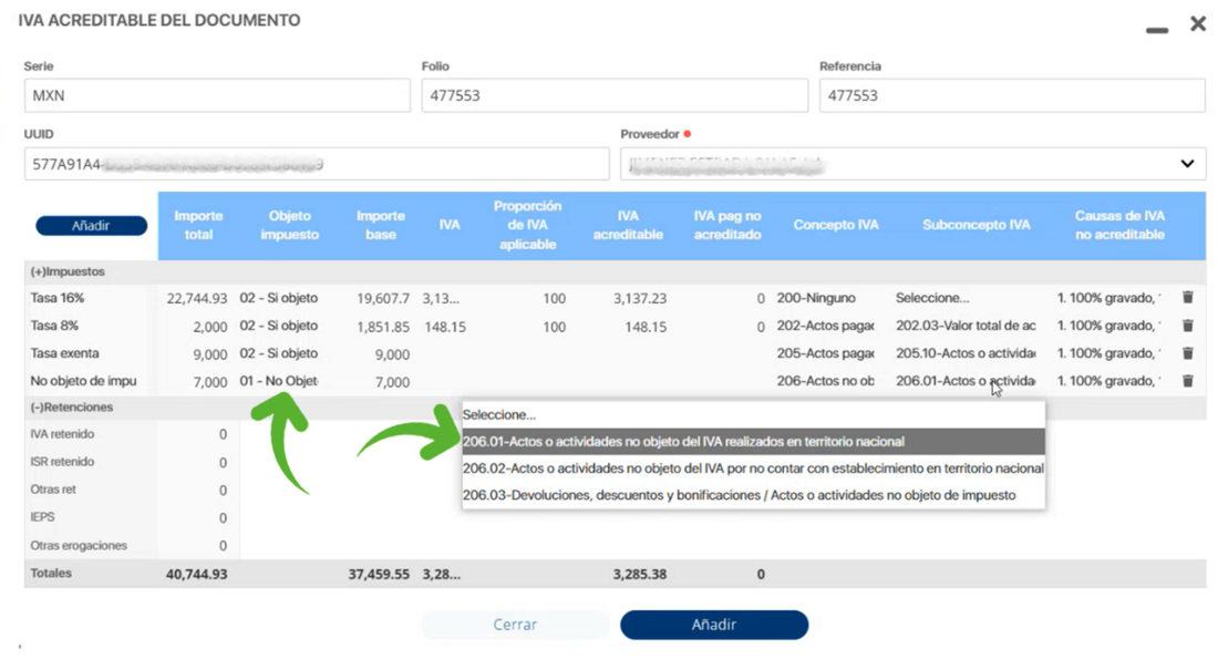 Y en este caso para los no objeto de impuesto hay una clasificación para actos o actividades no objeto del IVA realizados en territorio nacional, o cuando no se cuenta con un establecimiento en territorio nacional o deducciones, descuentos y bonificaciones. En este caso el subconcepto predeterminado es "206.01-Actos o actividades no objeto del IVA realizados en territorio nacional".