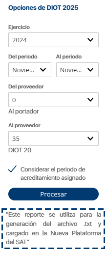 Selecciona el "Ejercicio"y "Periodo"deseado así como el rango de proveedores y haz clic en el botón "Procesar". Observa que al final agregamos una nota aclaratoria sobre el archivo de texto que se generará.