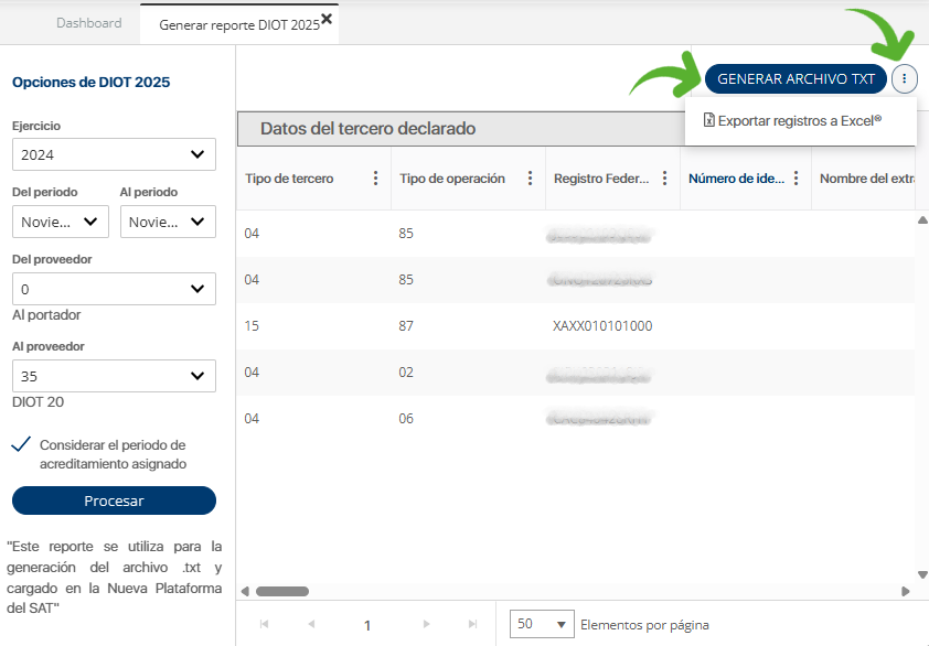 Haz clic en el botón "Generar archivo TXT" o "Exportar registros a Excel®", según lo requieras, sólo considera que el archivo para cargar a la plataforma del SAT es el de texto.