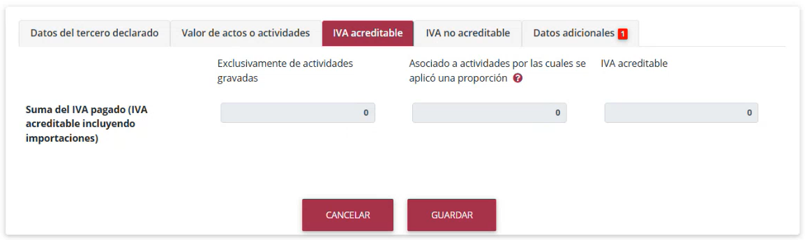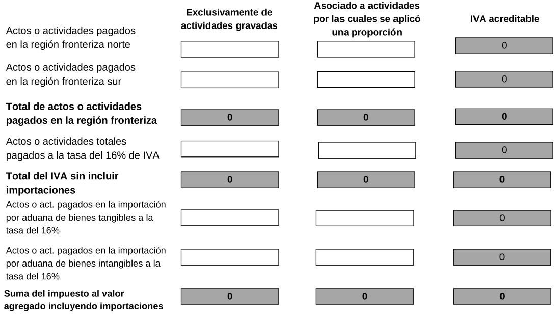 En esta sección se identifica el IVA que te estás acreditando al 100% así como el IVA acreditado como parte proporcional cuando no es posible acreditar todo, también separadas por regiones, por ejemplo: La compra de un automóvil, viáticos o algún concepto del cual por ley no es permitido acreditar al 100%.