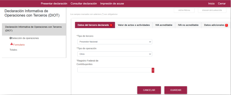 Ampliación de campos: La declaración cambia por completo, el número de campos disponibles para el llenado de la declaración pasa de 24 a 54 campos divididos en 5 secciones (1.Datos del tercero declarado, 2.Valor de los actos o actividades, 3.IVA acreditable, 4.IVA no acreditable, 5.Datos adicionales), ofreciendo mayor capacidad de detalle.