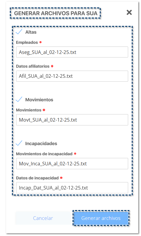 Se mostrará la siguiente ventana de parámetros para la generación de los archivos para SUA, con base a los movimientos registrados durante el rango de fechas seleccionado.