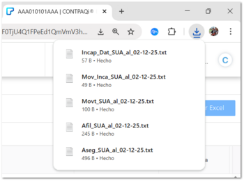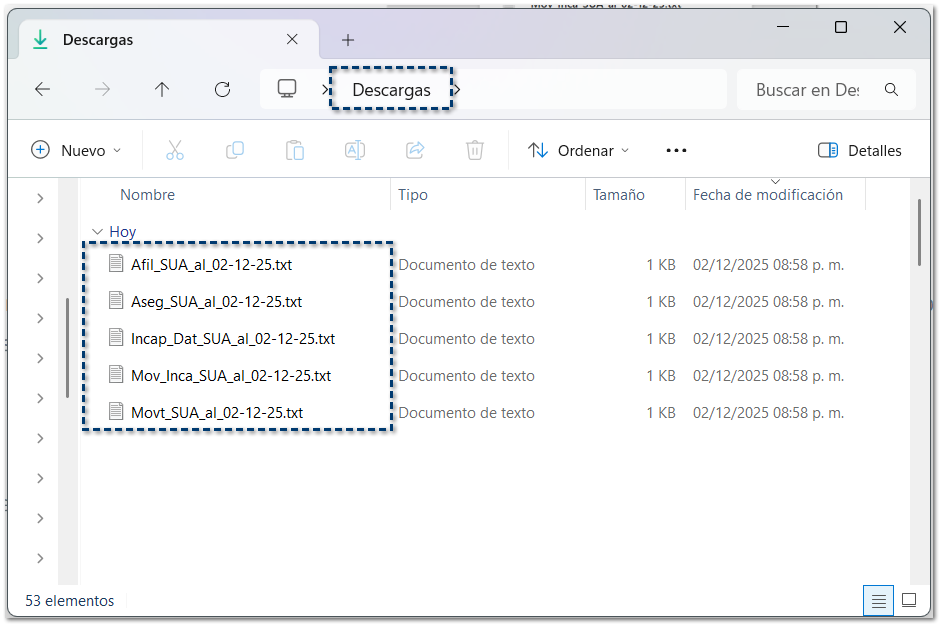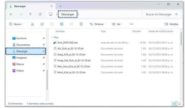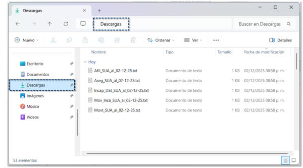 Dentro de la carpeta de Descargas de Windows®, podrás encontrar los archivos generados de los tipos de movimiento seleccionados (altas, movimientos e incapacidades).