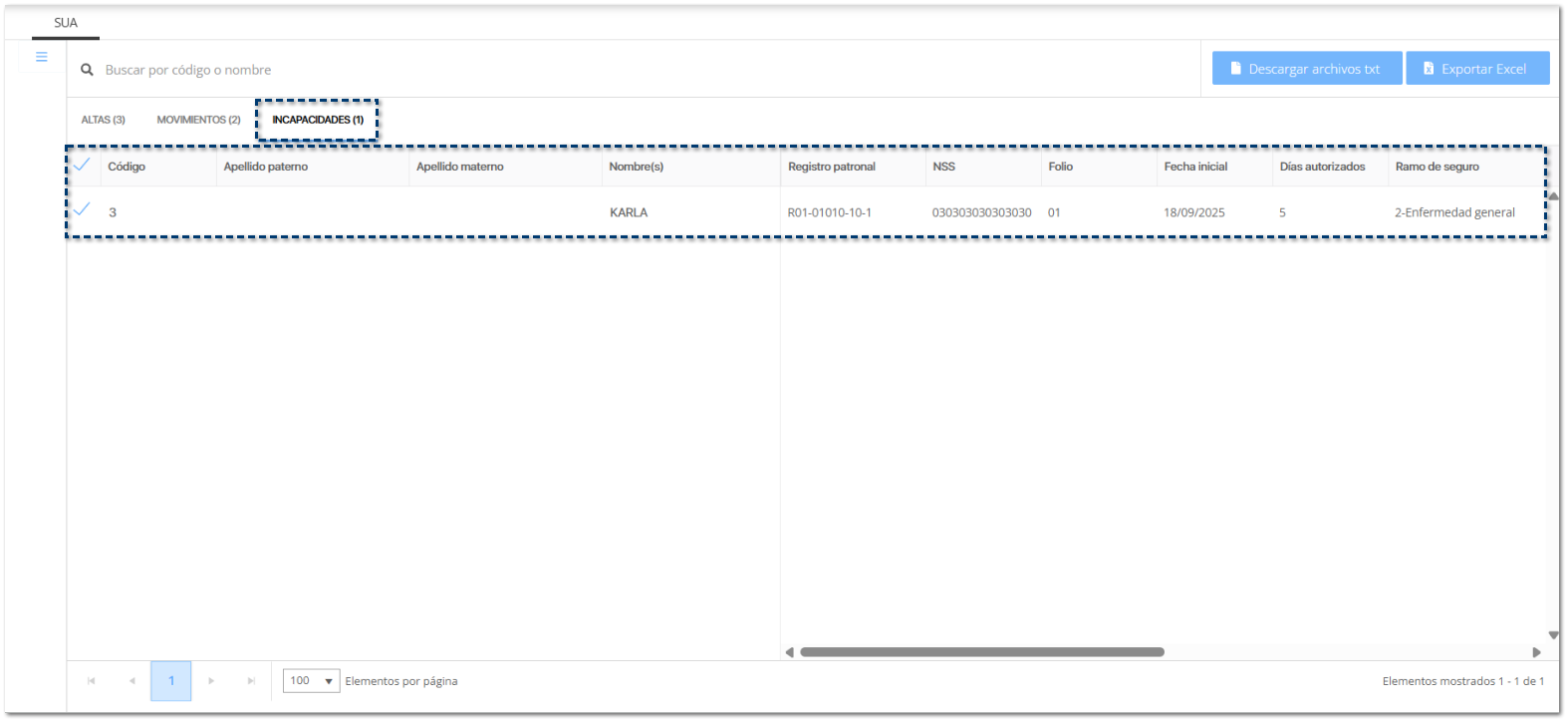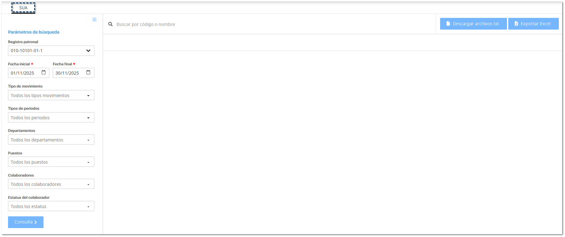 Visualizarás todos los movimientos de baja, modificación de salario, reingreso y ausentismo de cada colaborador, con base al rango de fechas seleccionado, para revisar y exportar los movimientos al SUA.