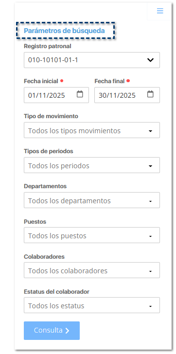 Una vez que has definido los parámetros de búsqueda para la generación de movimientos de los colaboradores, haz clic en el botón Consulta>