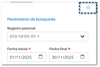 Para ejecutar este proceso, necesitas definir los siguientes filtros dentro de la ventana de Parámetros de búsqueda: