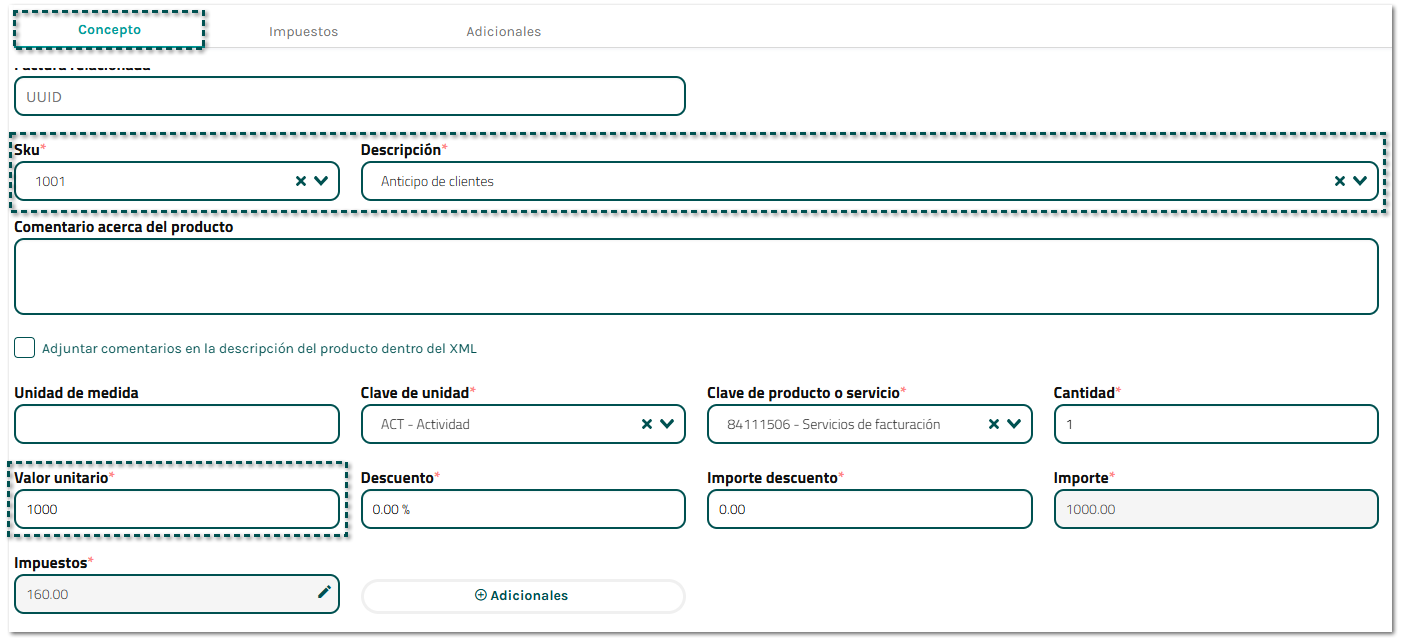 Al crear dicho documento, agrega una partida y añade el Servicio de "Anticipo de clientes", captura en el campo "Valor unitario" el importe de $1,000 + I.V.A. = $1,160.00.