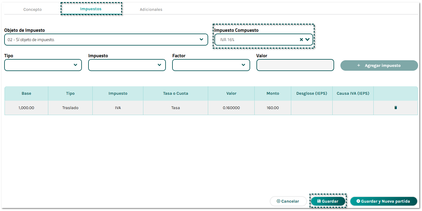 En la pestaña Impuestos, configura el impuesto correspondiente, para este caso el IVA 16% y haz clic en el botón Guardar: