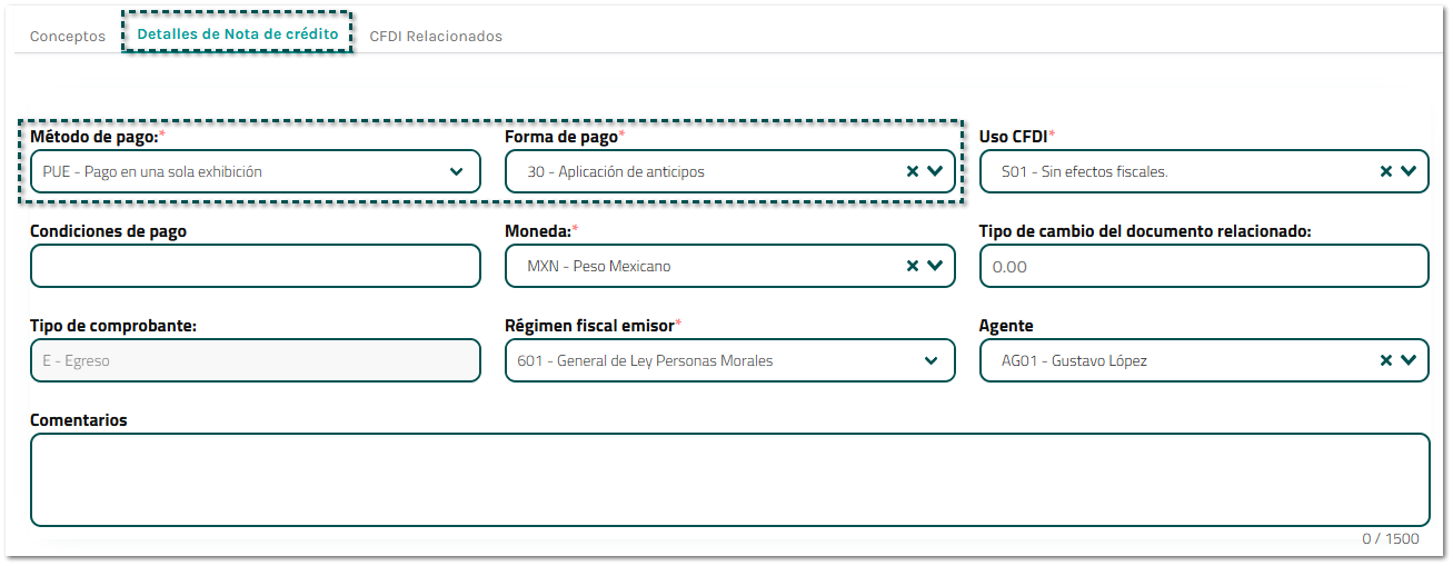 Desde la pestaña Destalles de la nota de crédito, elige el Método de pago "PUE" y la Forma de pago "Aplicación de anticipos".