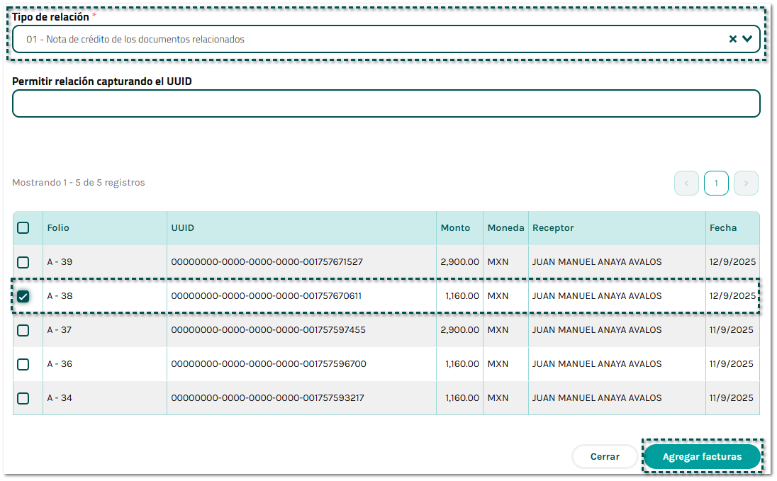 Luego, dirígete a la pestaña CFDI Relacionados, haz clic en el botón Agregar el UUID, elige la opción "01 - Nota de crédito de los documentos relacionados" en el campo "Tipo de relación" y adiciona el CFDI del anticipo anteriormente creado en el proceso / paso uno (1), después haz clic en el botón "Agregar facturas".