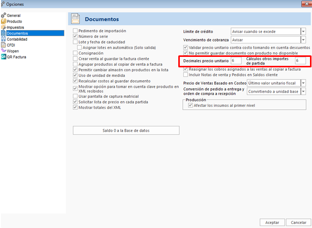 4. En los campos "Decimales precio unitario" y "Cálculos otros importes de partida" cambiar el valor de los decimales a 6.