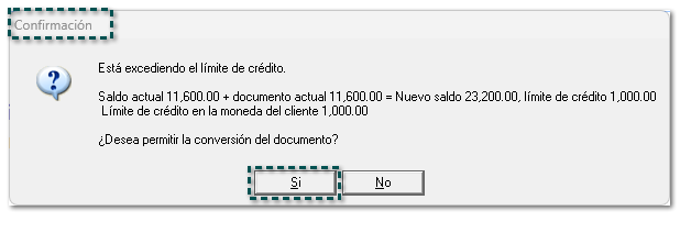 En versiones anteriores, al tratar de transformar dicho documento, aparecía el mensaje "Esta excediendo el límite de crédito. ¿Desea permitir la conversión del documento?", por lo que al dar clic en el botón Sí, no realizaba la transformación.