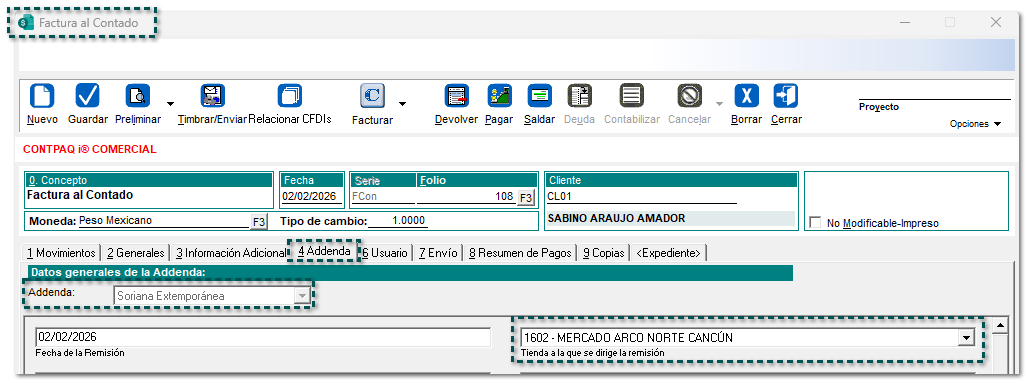 A partir de ahora, se agregan las sucursales: 1602 - MERCADO ARCO NORTE CANCÚN, 686 - JM IGLESIAS, 712 - SANTOS DUMON, 703 - RIVERA DEL LAGO y 701 - ROMANZZA en el campo "Tienda a la que se dirige la remisión" a nivel Documento para la Addenda Soriana Extemporánea.