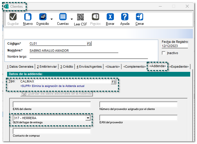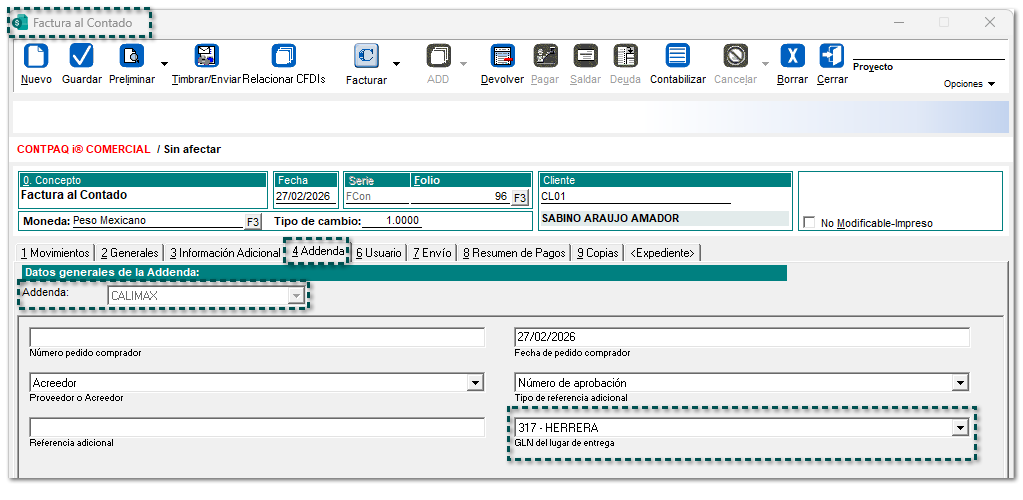 Folio D765511 A partir de esta versión, se adicionan las sucursales 317 - HERRERA y 318 - VIZCAINO en el campo "GLN del lugar de entrega" en la Addenda CALIMAX a nivel de: Cliente Documento