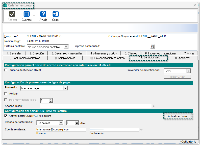 Si se requiere actualizar el Nombre de la empresa, se podrá realizar la actualización de manera manual por lo que se tendrá que dar clic en el botón Actualizar datos desde pestaña 11. Servicios web de la Redefinición de la empresa, para enviar los datos más recientes al portal CONTPAQi Mi Factura: