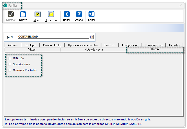 Desde el perfil del usuario, podrás definir qué perfiles podrán tener accesos y permisos para ingresar a las opciones del menú Buzón, por lo que, se adiciona la pestaña "Buzón" dentro de la ventana de los Perfiles de usuario.