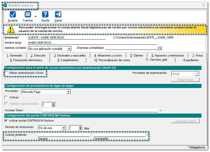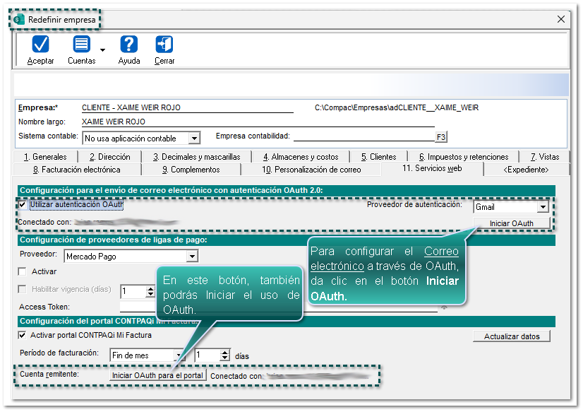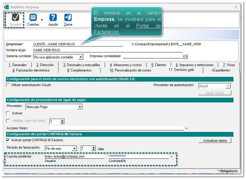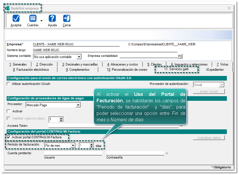 Desde la pestaña 11. Servicios web de la Redefinición de la empresa, se podrá habilitar el uso del Portal de facturación, con la finalidad de dar acceso a los clientes para generar y consultar facturas, así como definir un periodo de tiempo para generarlas.