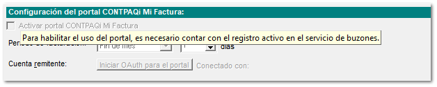 Para poder hacer uso del Portal de facturación, será necesario contar con un registro activo en el servicio de Buzón, de lo contrario, al tratar de habilitar el uso de dicho portal, aparecerá el mensaje "Para habilitar el uso del portal, es necesario contar con el registro activo en el servicio de buzones.