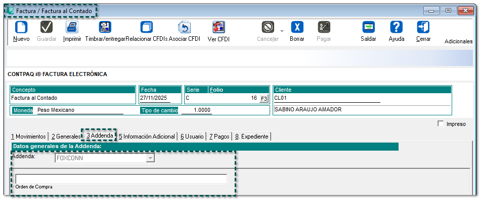 Addenda "FOXCONN" C736826 A partir de ahora, se incluye la Addenda FOXCONN al sistema comercial, con los siguientes campos de captura a nivel de: Documento