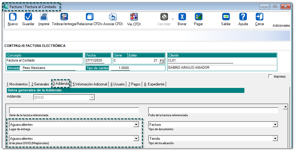 Folio D749423 A partir de ahora, se agrega la sucursal: Aguascalientes, en el campo "Id de plaza OXXO (Mayúsculas)" y "Lugar de entrega" a la Addenda OXXO a nivel de Documento: