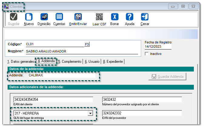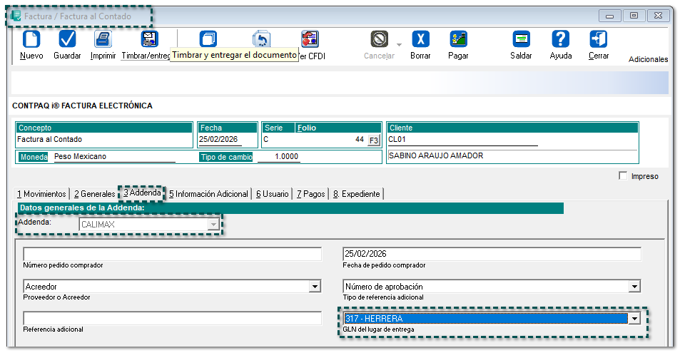 Folio D765508 A partir de esta versión, se agregan las sucursales: 317 HERRERA y 318 - VIZCAINO en el campo "GLN del lugar de entrega" a la Addenda CALIMAX a nivel: Cliente: Documento: