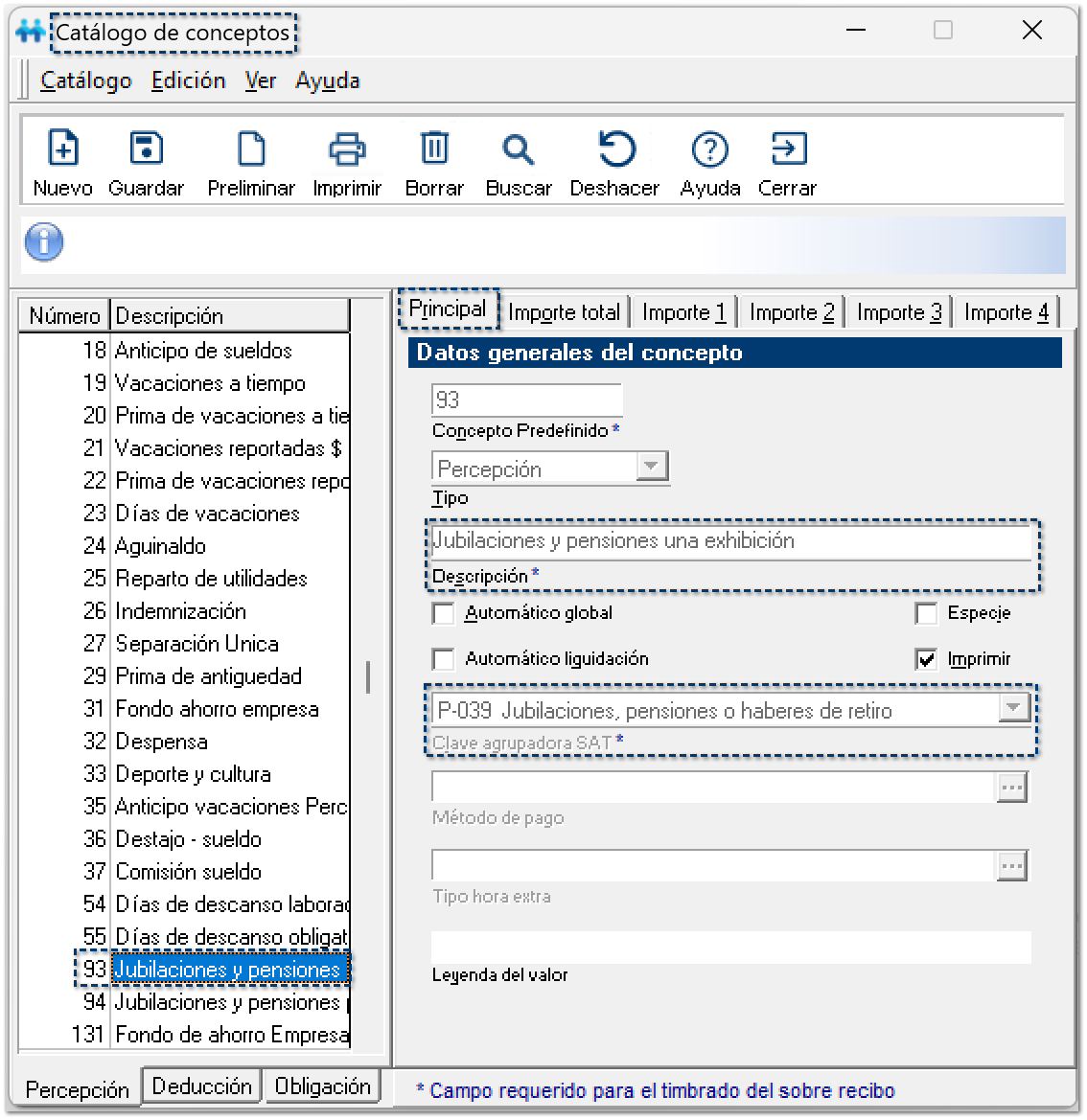 A partir de esta versión, se cuenta con los conceptos de percepción 93 – Jubilaciones y pensiones una exhibición y 94 – Jubilaciones y pensiones parcialidades, los cuales permiten registrar y timbrar correctamente los pagos realizados a pensionados y jubilados, de acuerdo con la forma en que se efectúe el pago.