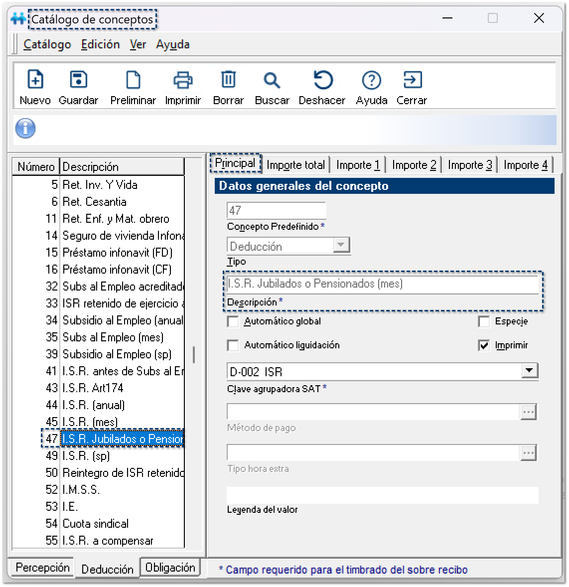 Dentro del catálogo de conceptos, se encuentran disponibles los conceptos de percepción:
