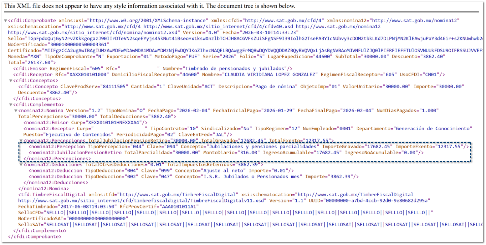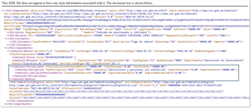 Con ello, se garantiza que los recibos de jubilados y pensionados cumplan con la estructura fiscal requerida y puedan timbrarse sin inconsistencias.