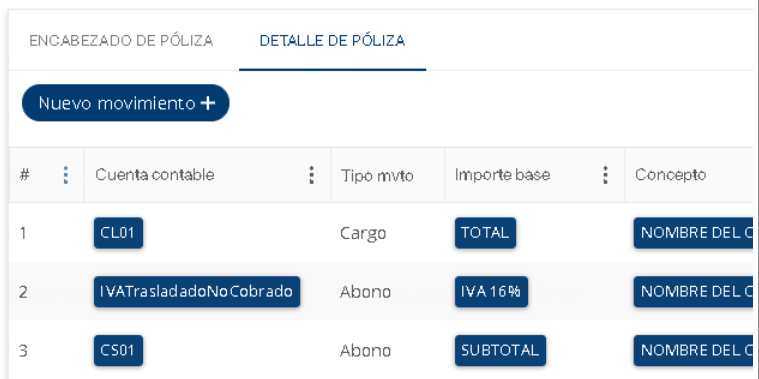 6. Se habilitará la pestaña de Detalle de póliza, en donde se podrán configurar los movimientos que tendrá la plantilla de póliza.