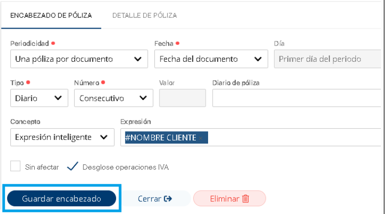 4. Configurar los datos de encabezado de la póliza, según se requiera contabilizar este tipo de documentos.