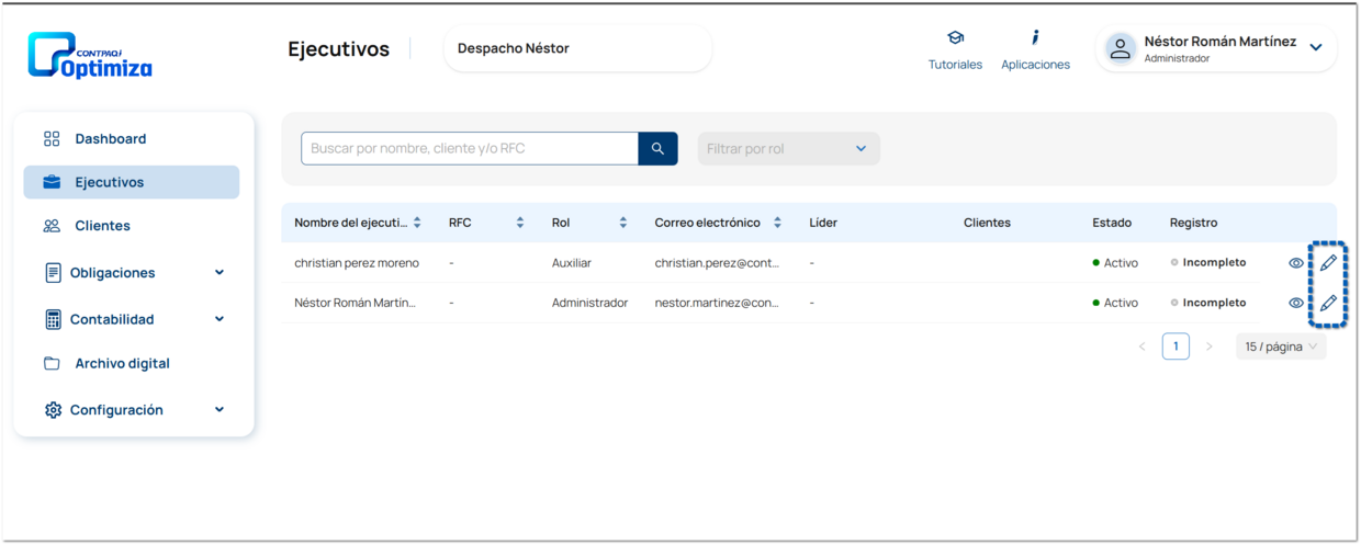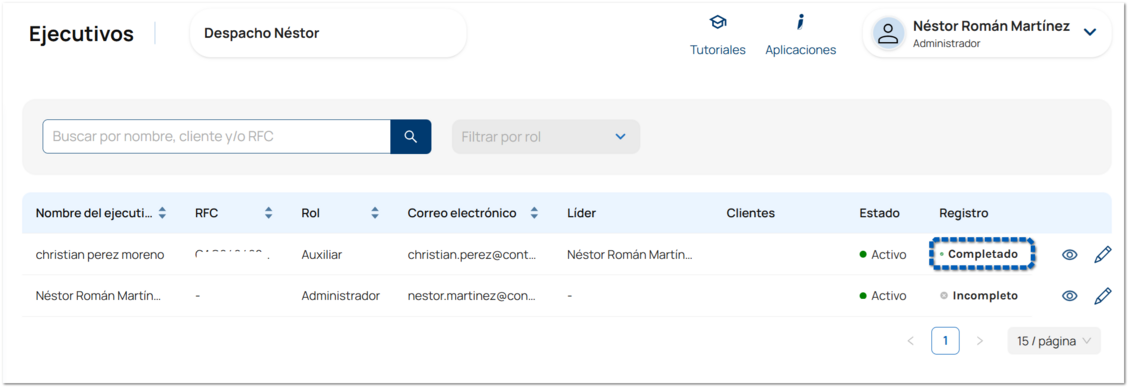 Una vez que registraste los ejecutivos que colaboran en tu despacho, puedes agregar en cualquier momento la información faltante en cada uno de ellos desde el listado de Ejecutivos. En la columna Registro, si el ejecutivo tiene su información completa se mostrará el estado Completado, de lo contrario se mostrará el estado Incompleto.
